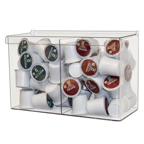 This mini bin holds individually packaged personal care items or other miscellaneous supplies. It features 2 compartments, a hingeless lid, and keyholes for wall mounting (or it can sit on a counter). Clear PETG Plastic. Made in the USA. Weight: 1.75 lb. Dimensions: 12.30″W x 8.00″H x 5.22″D