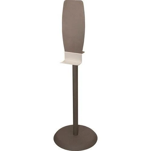 This floor stand features a standard back plate for use with hand sanitizer, hand lotion, or foam dispensers. No tools required to assemble. Self-righting base, up to 40 degrees past center (without dispenser). Bay Gray Powder-Coated Steel column and base and Bay Gray Powder-Coated Aluminum back plate. Includes a Quartz Beige ABS Plastic Drip Tray. Back plate made in the USA. Column and base made in China.