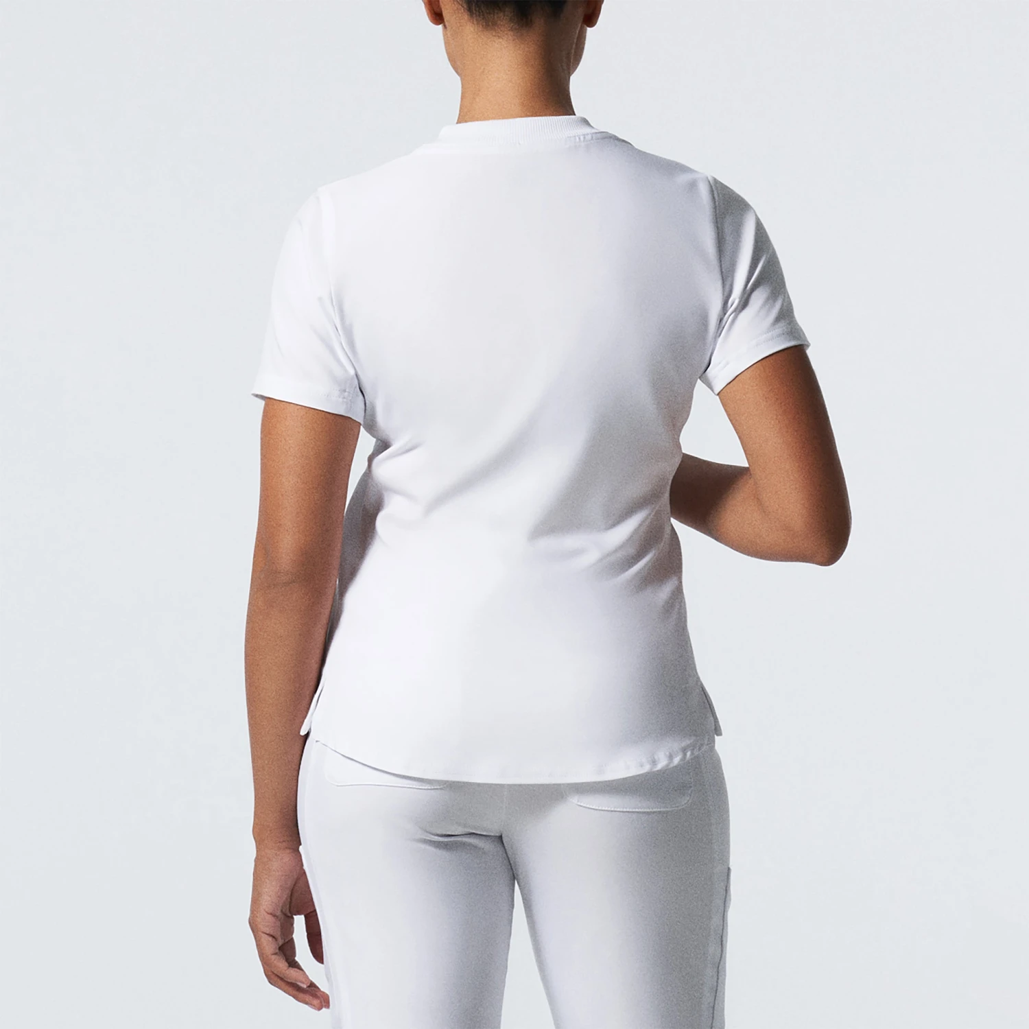 You will fall in love with this women’s scrub top with its soft rib-knit side panels and neckband, which allow for comfort and ease of movement. Two front welt pockets and a badge loop provide plenty of storage and an on-seam zipper pocket keeps your items secure. Our modern tailored fit flatters your shape, while our moisture-wicking super stretch fabric provides the comfort and flexibility your work requires throughout the day.