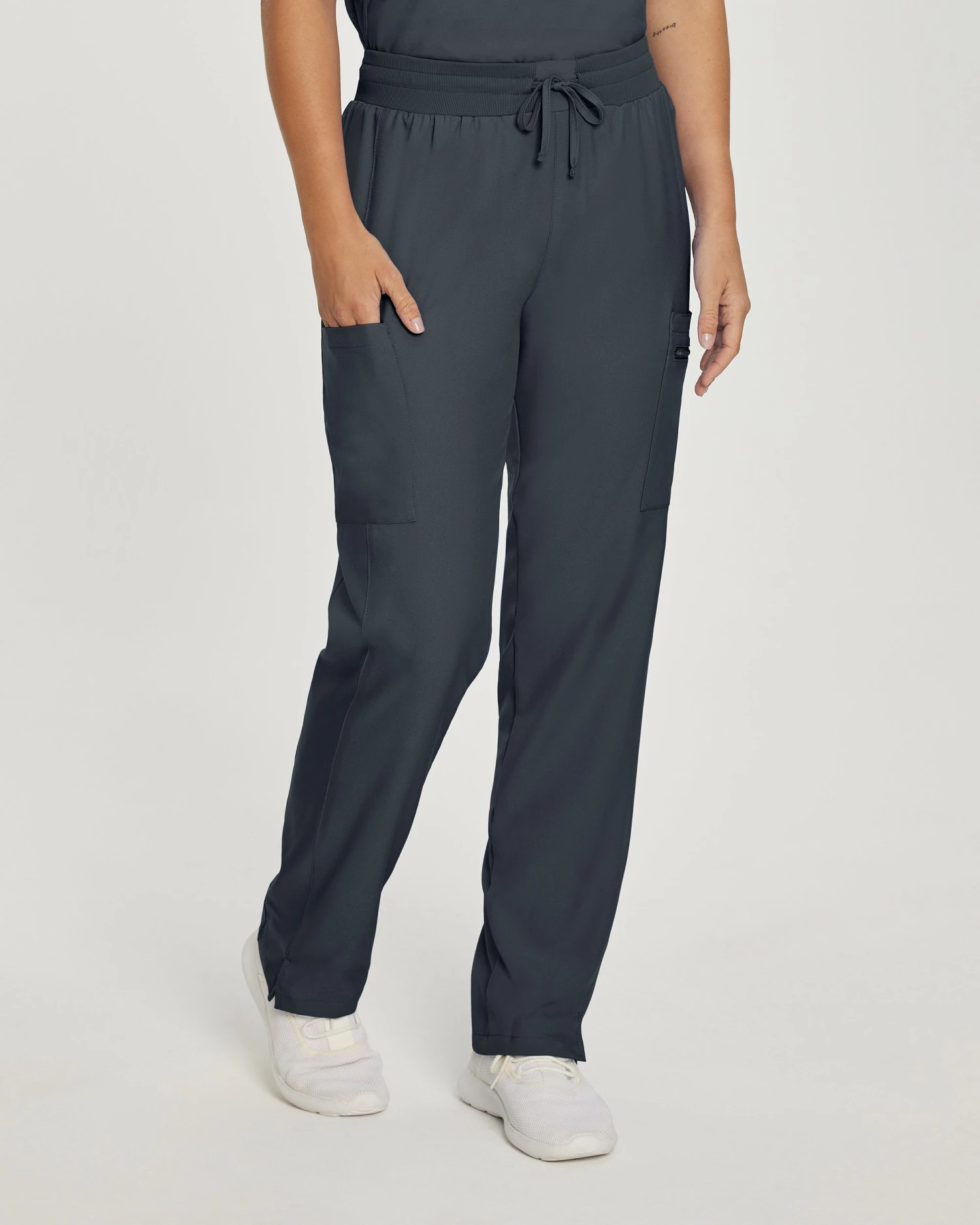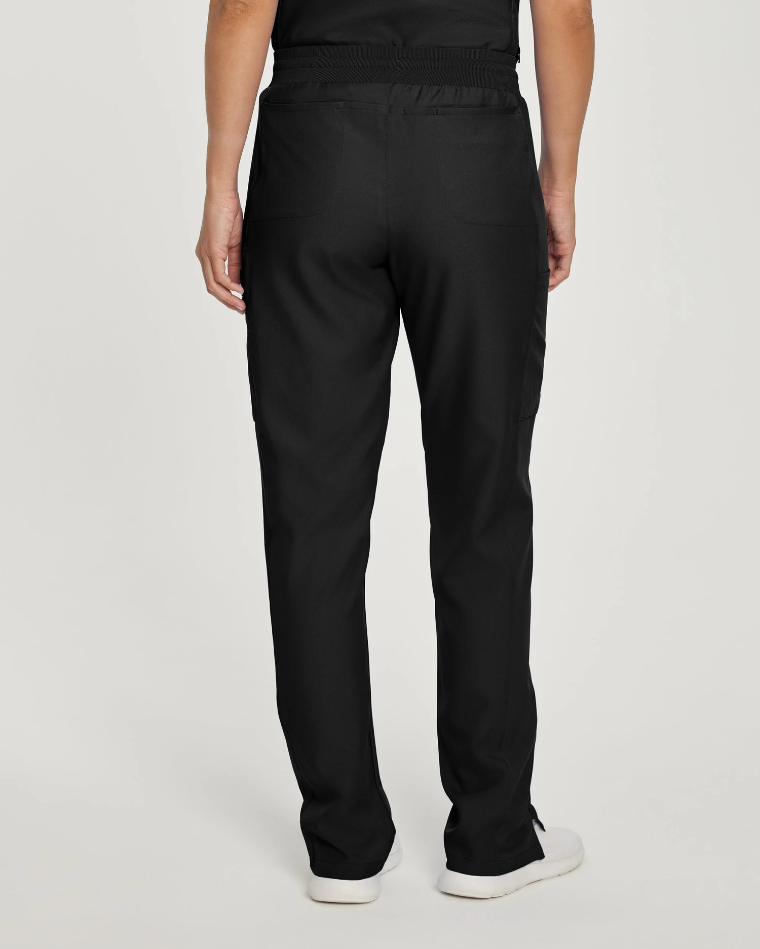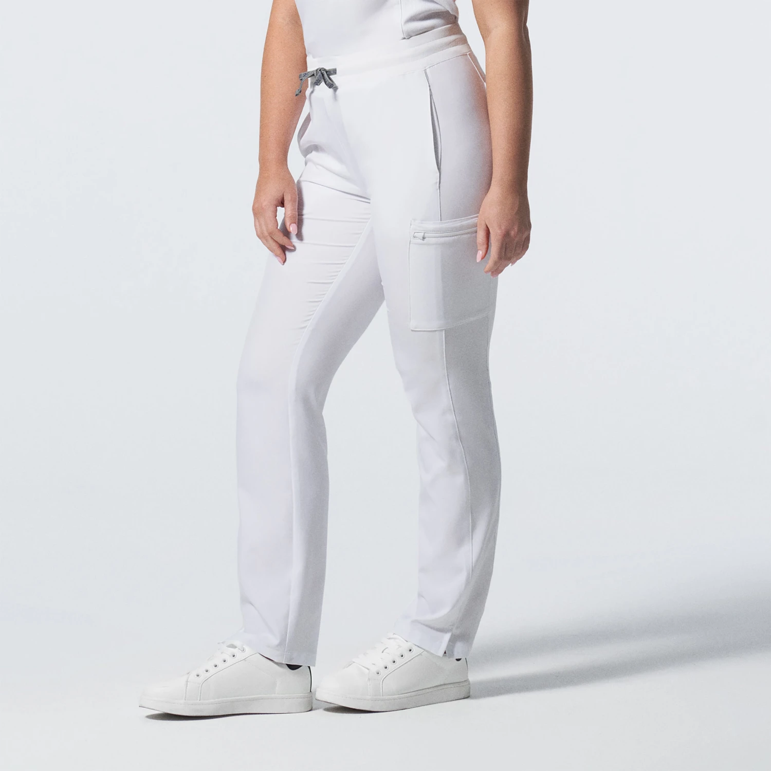 These women’s mid-rise straight-leg scrub pants feature a soft rib-knit waistband with a convertible drawstring that can be tied inside or outside the waist, giving you the ability to adjust your look as you see fit. Our modern tailored fit flatters your shape, while our moisture-wicking super stretch fabric provides the comfort and flexibility your work requires throughout the day. Seven pockets, including hidden hip pockets and a secure zip cargo pocket keep your essentials within easy reach.