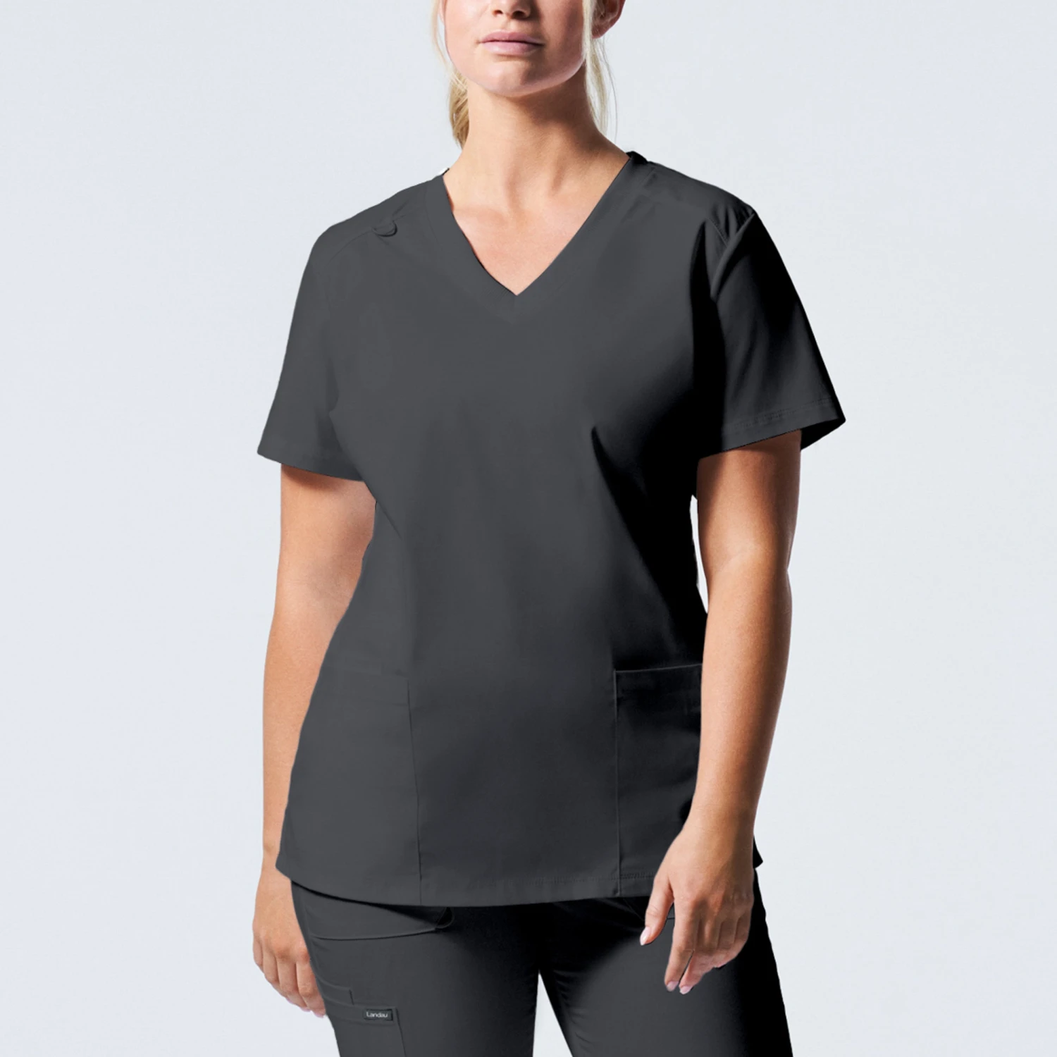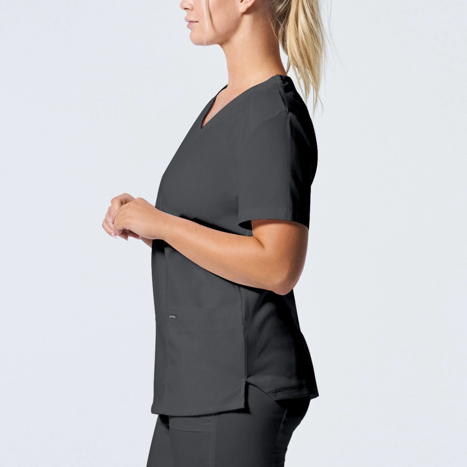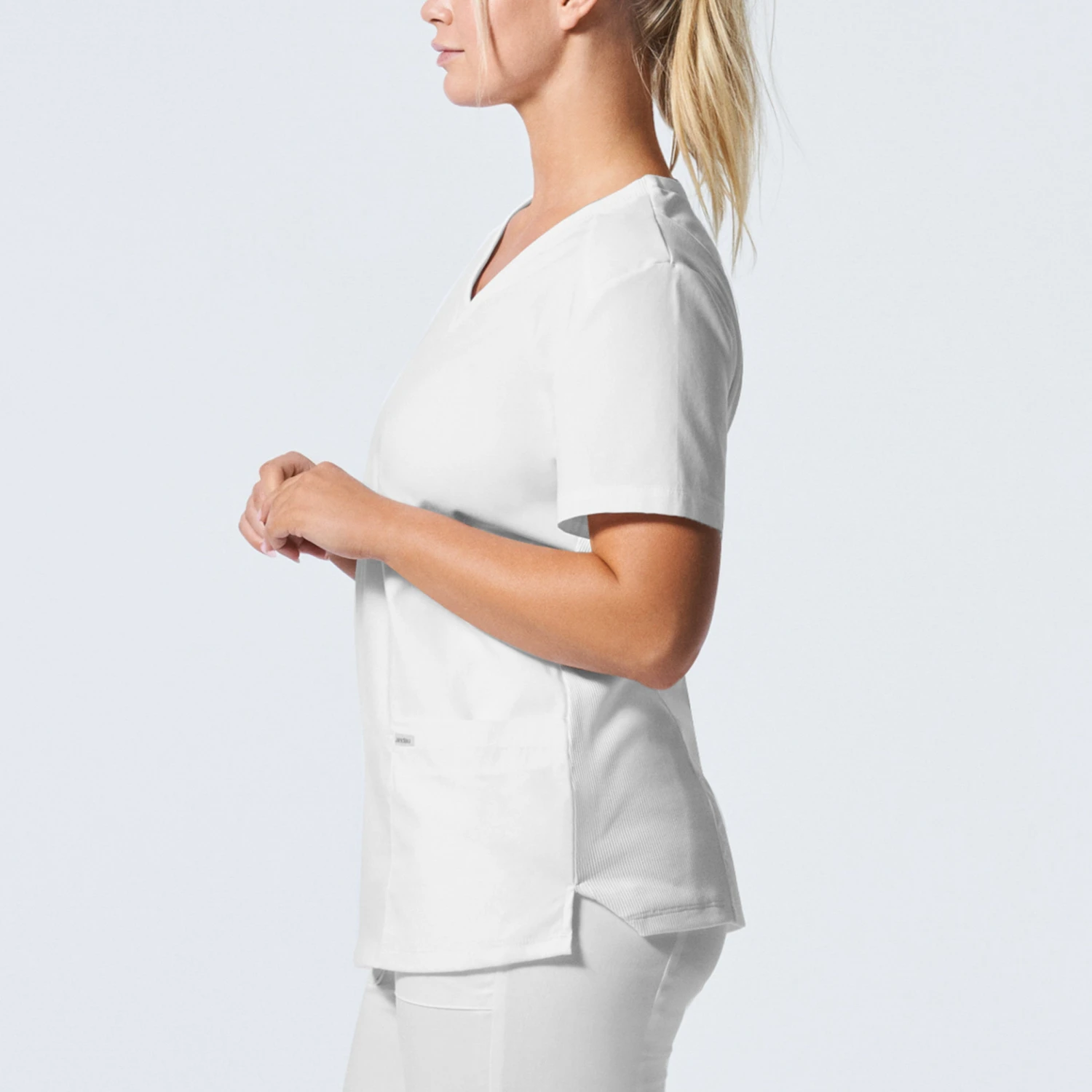 This Modern Fit, V-neck top not only is comfortable and high functioning. It features a rib knit neckband and back panels for extra comfort and movement. 2 Large pockets with a hidden elastic to hold stationary items close at hand an additional small pocket and side vents makes it perfect for your busy workday.