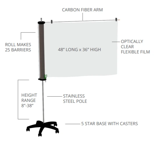 - 48″ wide x 36″ high barrier to aerosols and droplets
