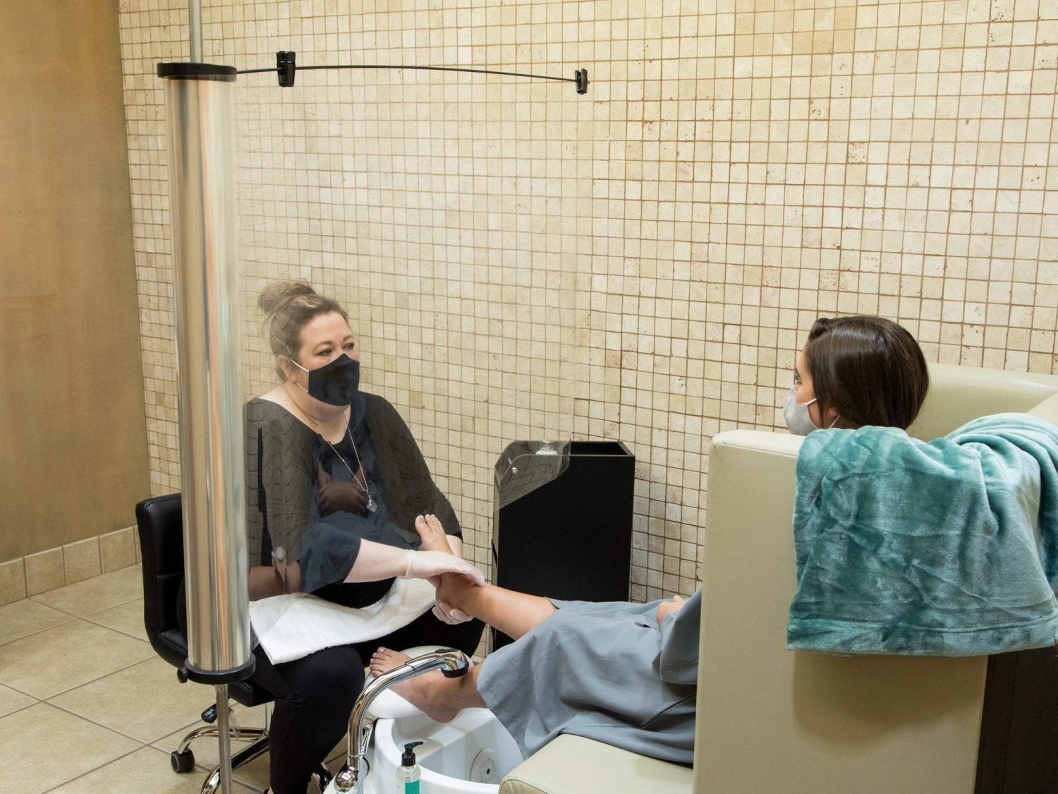 Oakworks Shield is designed to reduce the risk of contamination from aerosols and droplets by providing a barrier between therapists and guests. It is also effective in manicure/pedicure services, and separating guests from one another in larger rooms.