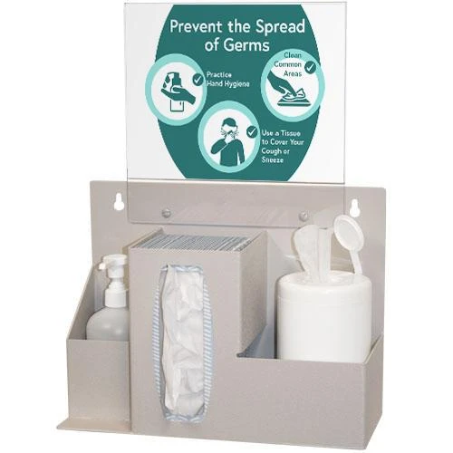 This Prevention Station holds an assortment of personal protection equipment supplies in a convenient dispenser. It can hold 1 to 2 boxes of facial tissue, 1 hand sanitizer bottle, and disposable wipe canister (tissues, and hand sanitizer not included). Always assemble and mount dispensers securely prior to loading with product. Quartz Beige ABS Plastic. Made in the USA.
