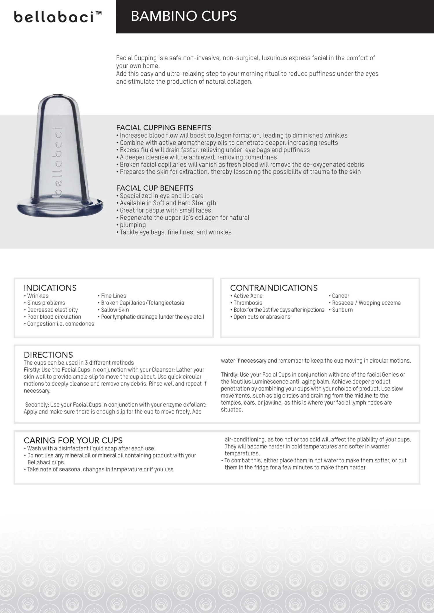 Designed for specialized areas around the eyes and mouth, Bellabaci Bambino Cups for facial cupping help skin acheive a youthful-looking glow. These pliable silicone cups are hand-squeezable and easy to use. No heat or pumps required! And unlike glass, if you drop a Bellabaci silicone cup, it won’t chip or break. Includes 2 strengths: Soft (pulls 4 cm) and Hard (pulls 10 cm).