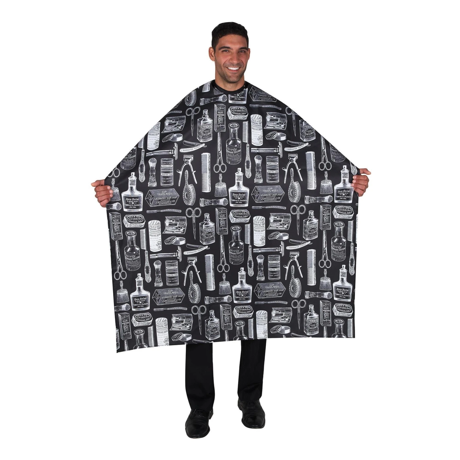 The Vintage Barber Cape is water resistant, lightweight polyester material with snap closure. Machine washable. Black. 45″W x 60″L