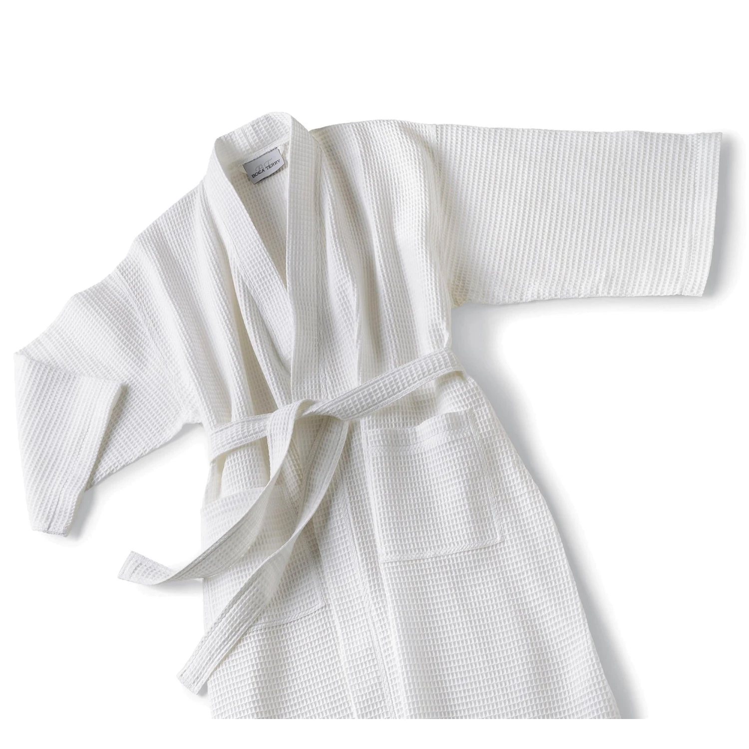 This 50/50 blend of cotton and poly makes a comfortable and lightweight cover-up that dries quickly and needs no ironing. This Multi Waffle Kimono Robe has two roomy pockets and a generous one-size-fits-all cut. Great for both men and women. White. 60″ circumference at the bottom of the robe.