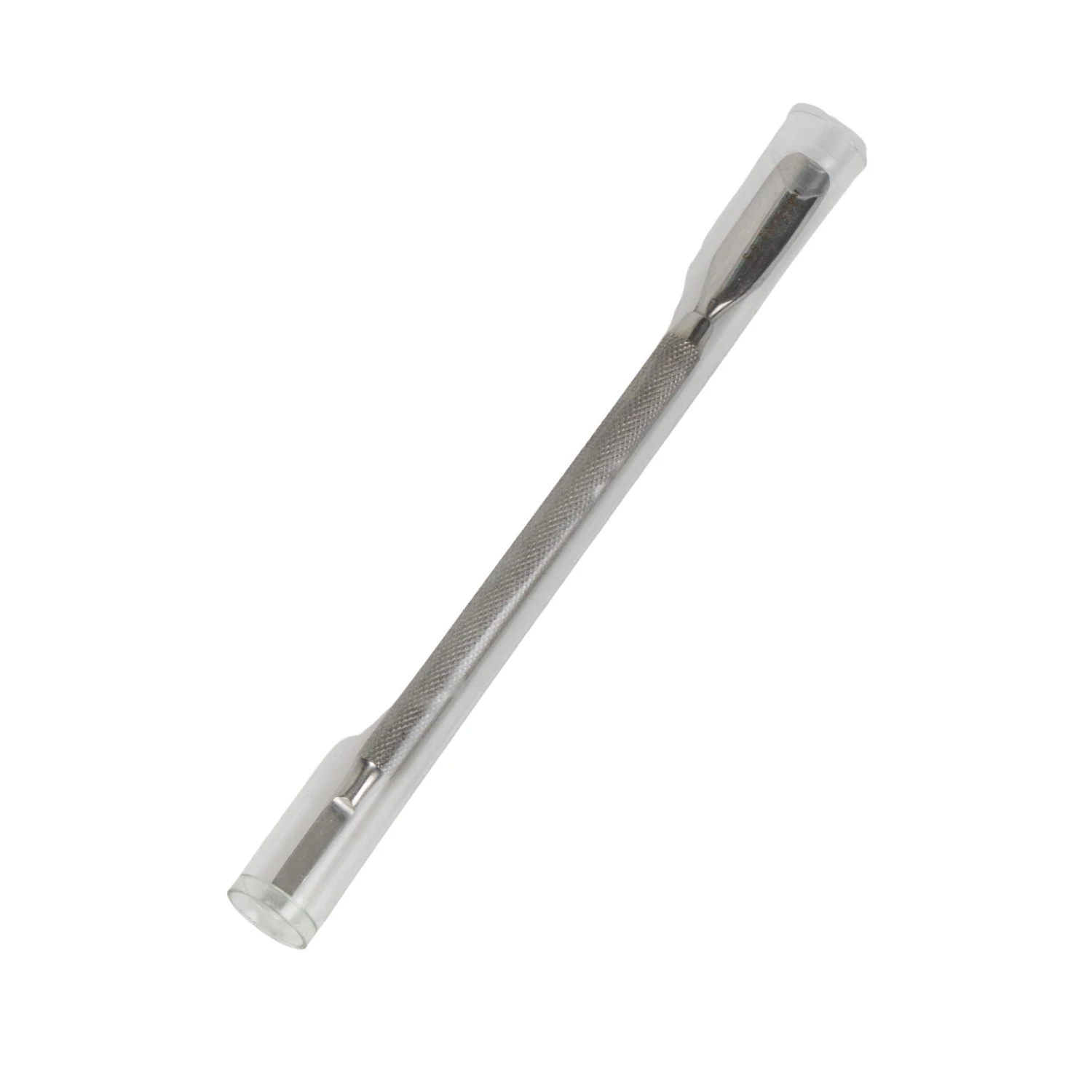 This dual-ended Cuticle Pusher with Flat End Tool features a carefully contoured end with a smooth, rounded tool head for gentle nudging of the cuticle and a flat-edged end for cleaning beneath and around the nail. Its textured stainless steel body ensures a firm, comfortable grip for precise control.
