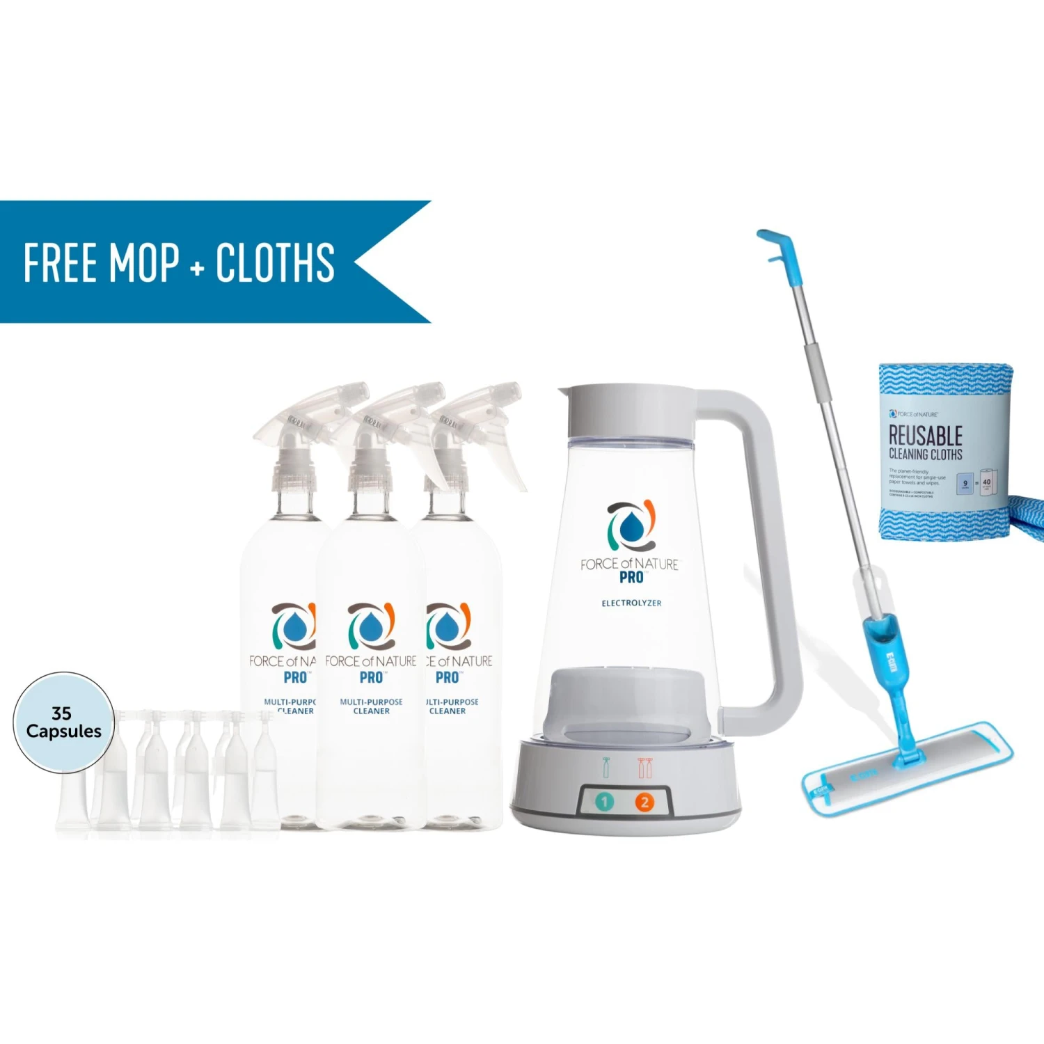 The ultimate cleaning upgrade for your spa or salon! This Force of Nature bundle eliminates toxic cleaners, single-use plastic bottles, and paper towels. It includes everything you need to make thirty-five 32 oz. bottles of powerful multi-purpose cleaner, plus 9 super absorbent reusable cleaning cloths that together replace 40+ rolls of paper towels. Tackle grease, grime, dirt, soap scum, odors, and sticky messes with squeaky-clean, odor-free results.