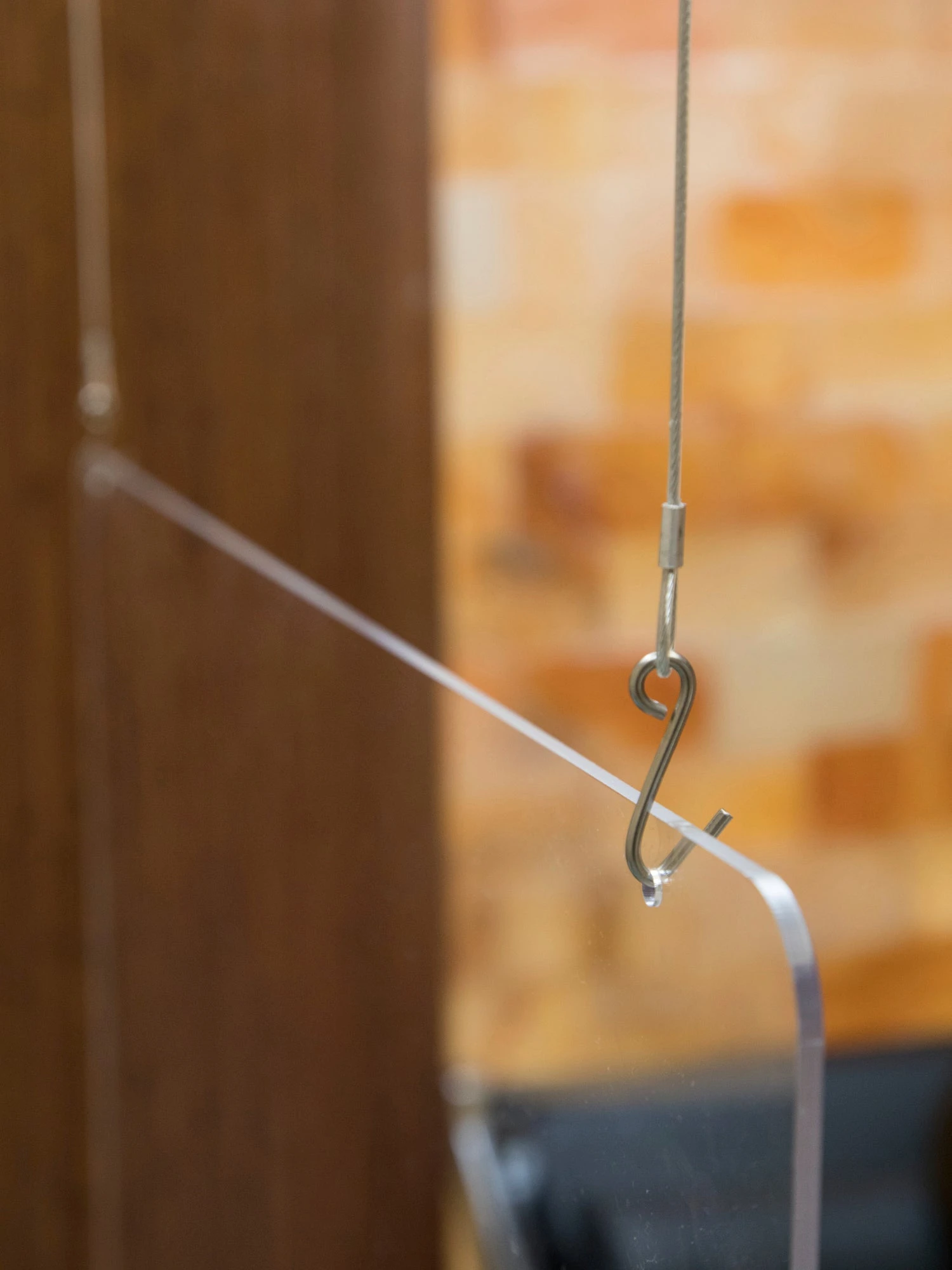 Protect yourself and your clients with this hanging acrylic Plexiglas sneeze guard. Hang it anywhere you need physical separation. Easily installed, it comes with two ceiling mounts and wires. Adjusts with just a push of a button to get desired length. Wires extend to 8′.