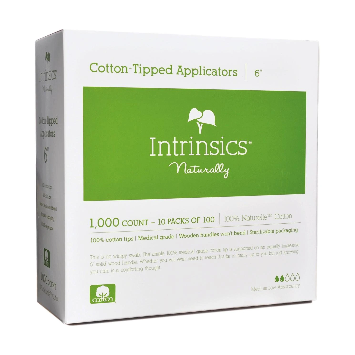 Take care of clients’ skin care services, cosmetic applications, and hard to reach spots with Intrinsics® 6” Cotton-Tipped Applicators. These single-ended, highly absorbent applicators are mounted on a sturdy, wooden handle that provides extra support and strength. 100% Cotton tip with a 6” handle. Medical grade. 1000 count.