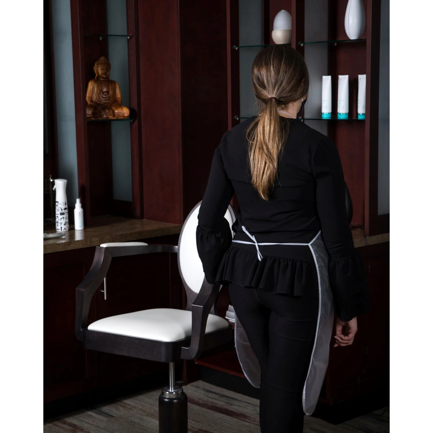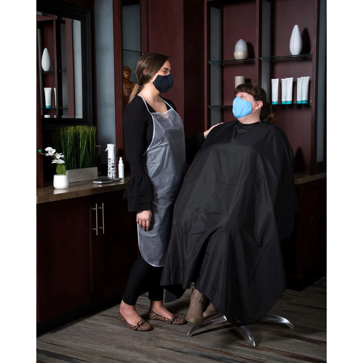 Made for salon and spa professionals, these reusable vinyl bib aprons offer a barrier against water, chemicals, and germs. Aprons feature round edges, a neck band, easy Velcro closure, and side tie tapes. Easily wash with warm soap and water. Wipe clean with damp cloth and allow to air dry. Latex-free. Thickness 4 mil (0.1 mm). Apron is 42″ x 36″, which is around knee-length for a person who is 5’8”.