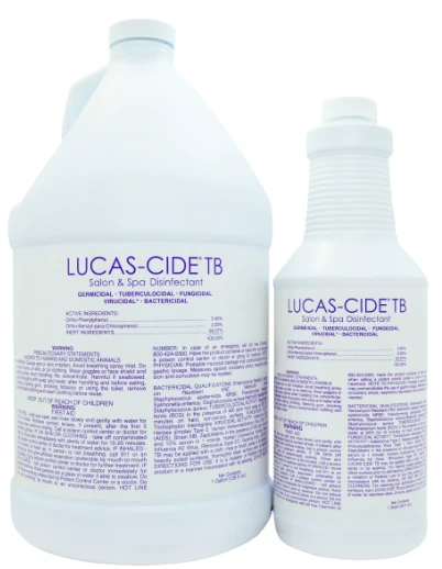 Lucas-Cide TB is a virucidal, germicidal, fungicidal, and tuberculocidal one-step disinfectant! Lucas-Cide TB kills 99.9% of viruses and bacteria on all hard, non-porous salon, spa, barber, and beauty surfaces. It also eliminates the need for additional specialized cleaning products like mirror cleaners, scouring powders, chrome cleaners, and bowl cleaners. Concentrated Lucas-Cide TB has a low pH with an anti-rust formula so it’s safe to soak and disinfect metals, stainless steel, plastics, combs, and shears.