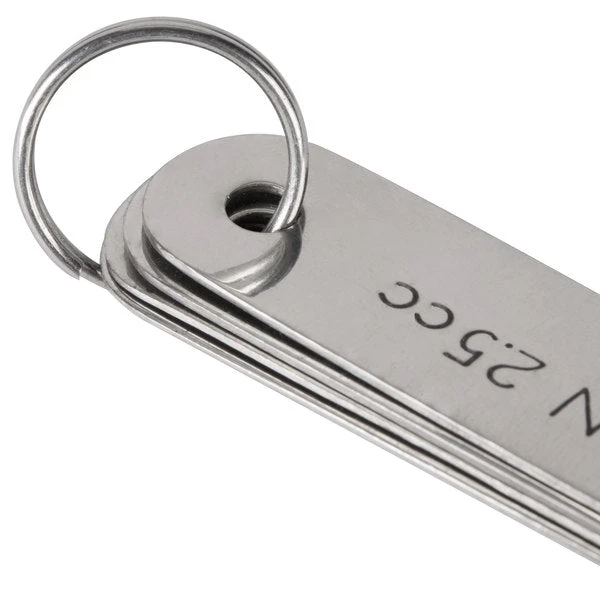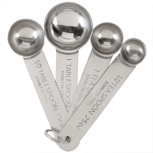 The set includes (1) 1/2 tsp., (1) 1 tsp., (1) 1/2 Tbsp., and (1) 1 Tbsp.