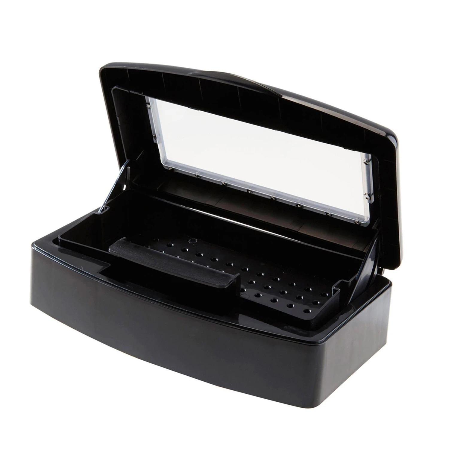 This compact, easy-to-use disinfection tray is ideal for disinfecting manicure and pedicure tools, skin care implements, hair shears, and non-porous files up to 7″. Implements will drain when the basket is raised, eliminating the need to reach into the disinfectant, reducing the chance of cross-contamination. Black with see-through window. Dimensions: 7.5″ W x 1.25″ H x 3″ D