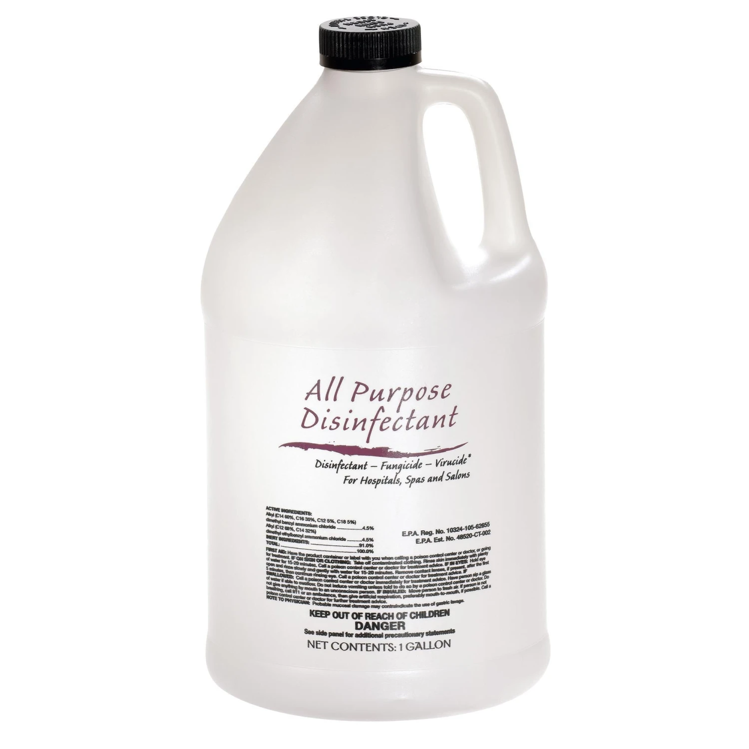 In a clean container, mix 2 oz. of All Purpose Disinfectant with 1 gallon of clean water. Spray or wipe on surface cloth and let sit on surface for 10 minutes. Soak combs and brushes for at least 10 minutes and change brush and comb water daily.