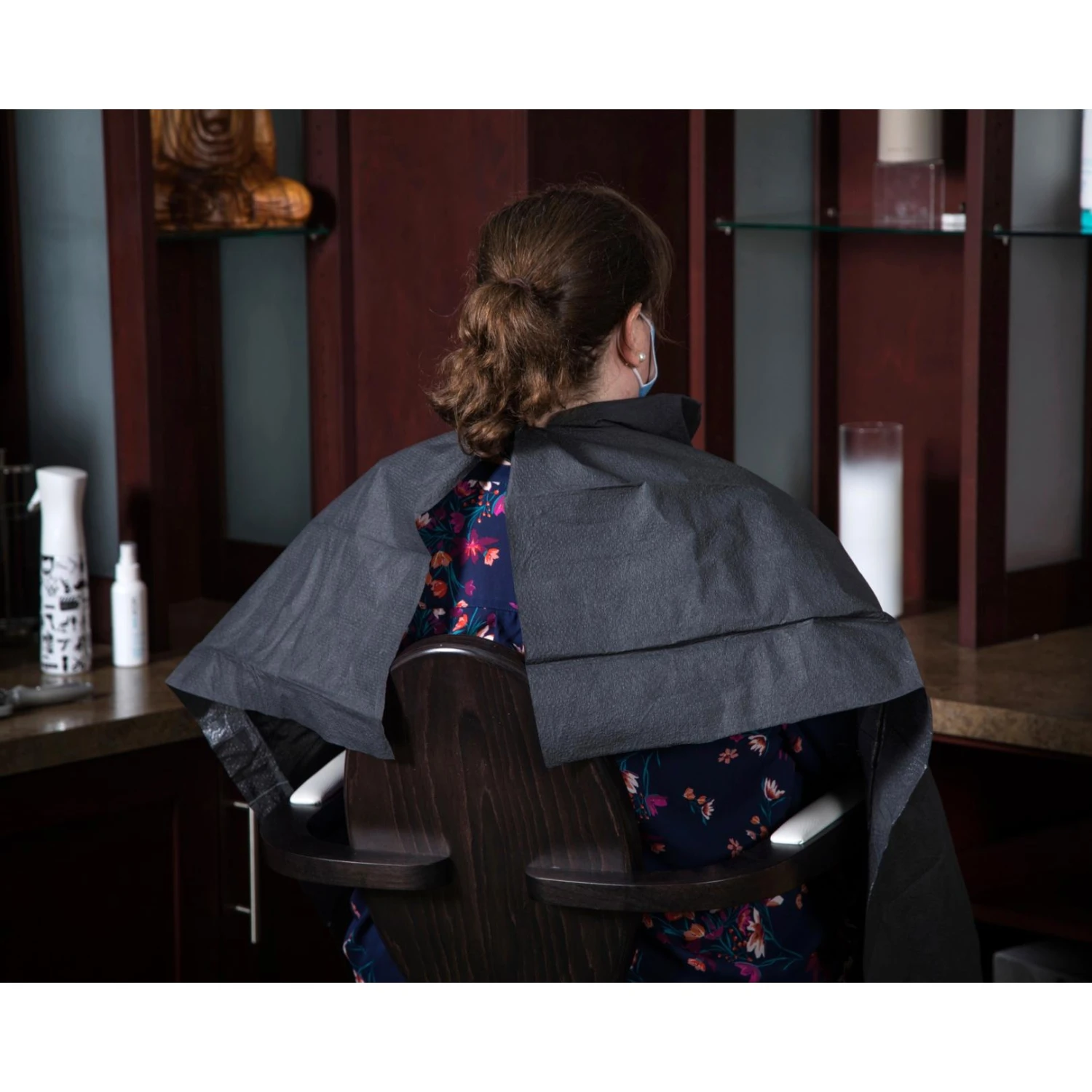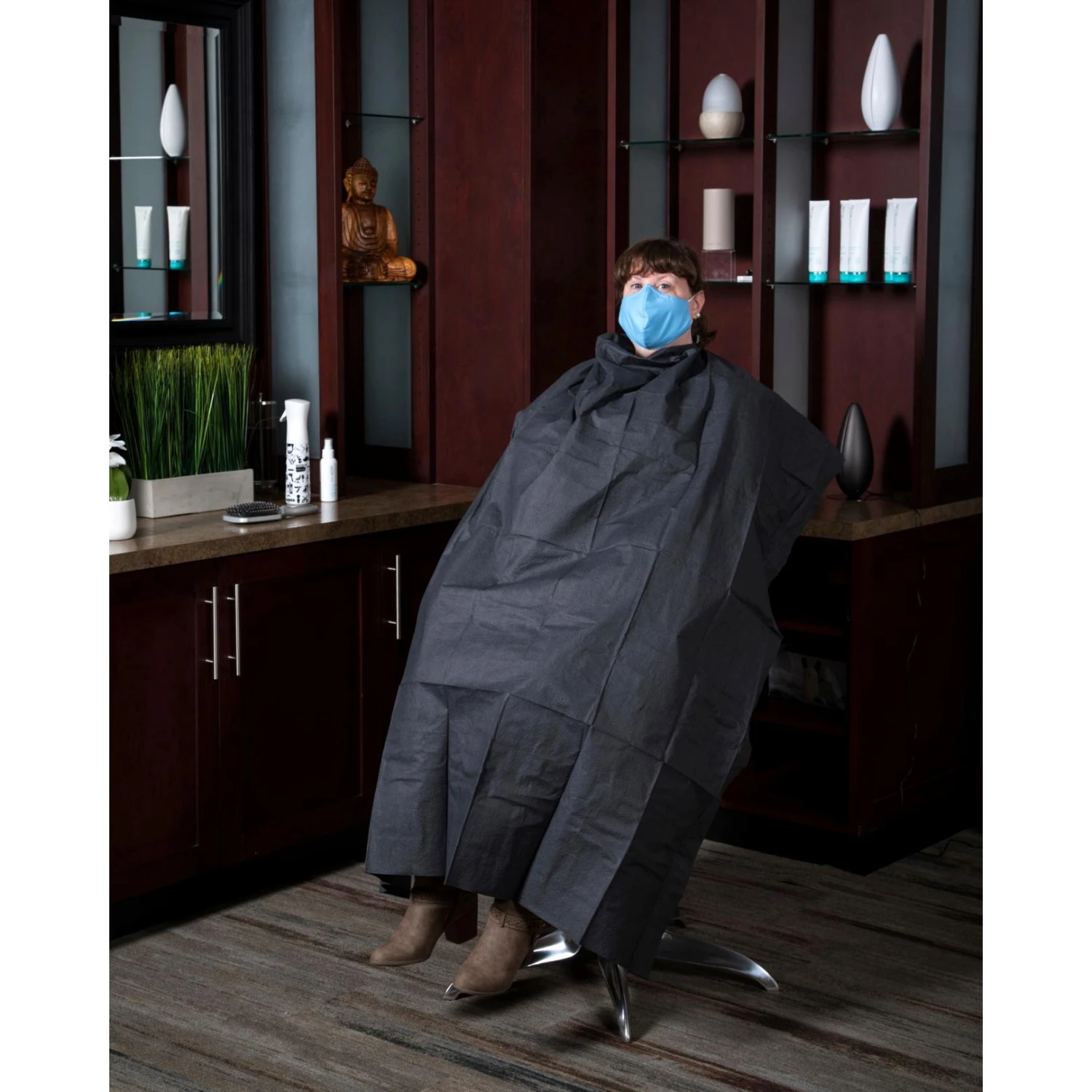 An excellent choice for new standards! These all-purpose disposable, single-use salon capes are great for cutting, coloring, bleaching, shampoo, makeup, and beard shaving. They’re easy to drape around your client and super convenient for quicker turnaround time between services. Lightweight yet durable enough for coloring and styling treatments. Capes are not individually wrapped. Constructed of tissue with a poly backing. 50 count bulk pack. Available in Black or White. 45″ W x 54″ L