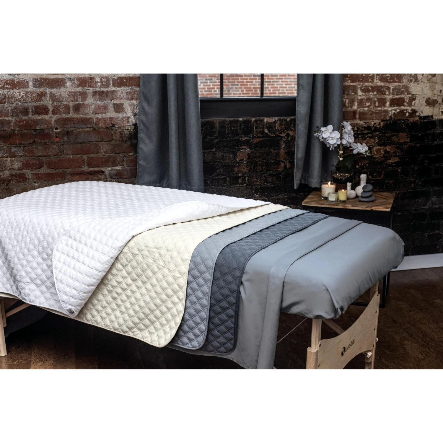 Create a soft, inviting look for your treatment tables and keep clients warm and cozy. Lightweight and quilted, these microfiber blankets are specially designed for spas. When you pull them from the dryer, they’re virtually wrinkle-free, and they hold their shape and size. Machine wash and dry. Available in Dove Grey, Slate Grey, Natural, and White. 85″ L x 58″ W