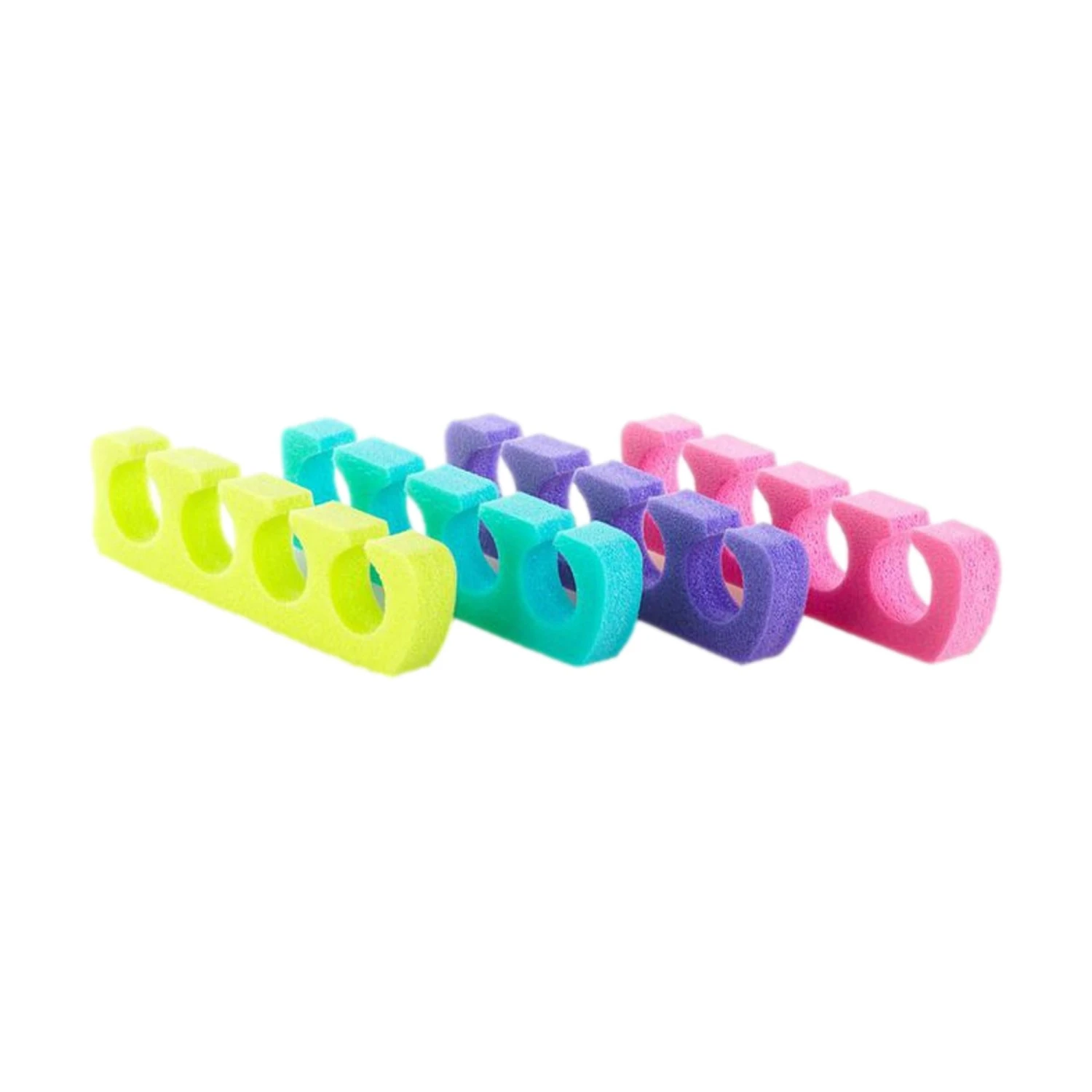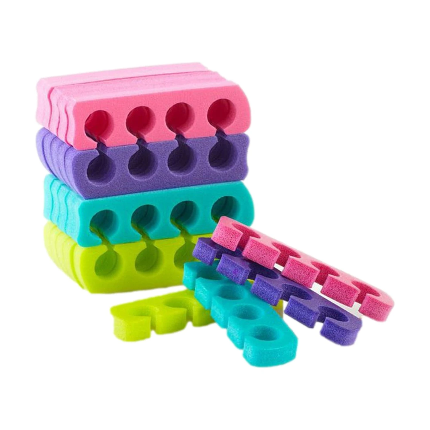 Enhance pedicures with these toe spacers, available in an assortment of colors—lime, pink, purple, and teal. Contains 12 pairs of toe spacers. Made in the USA.