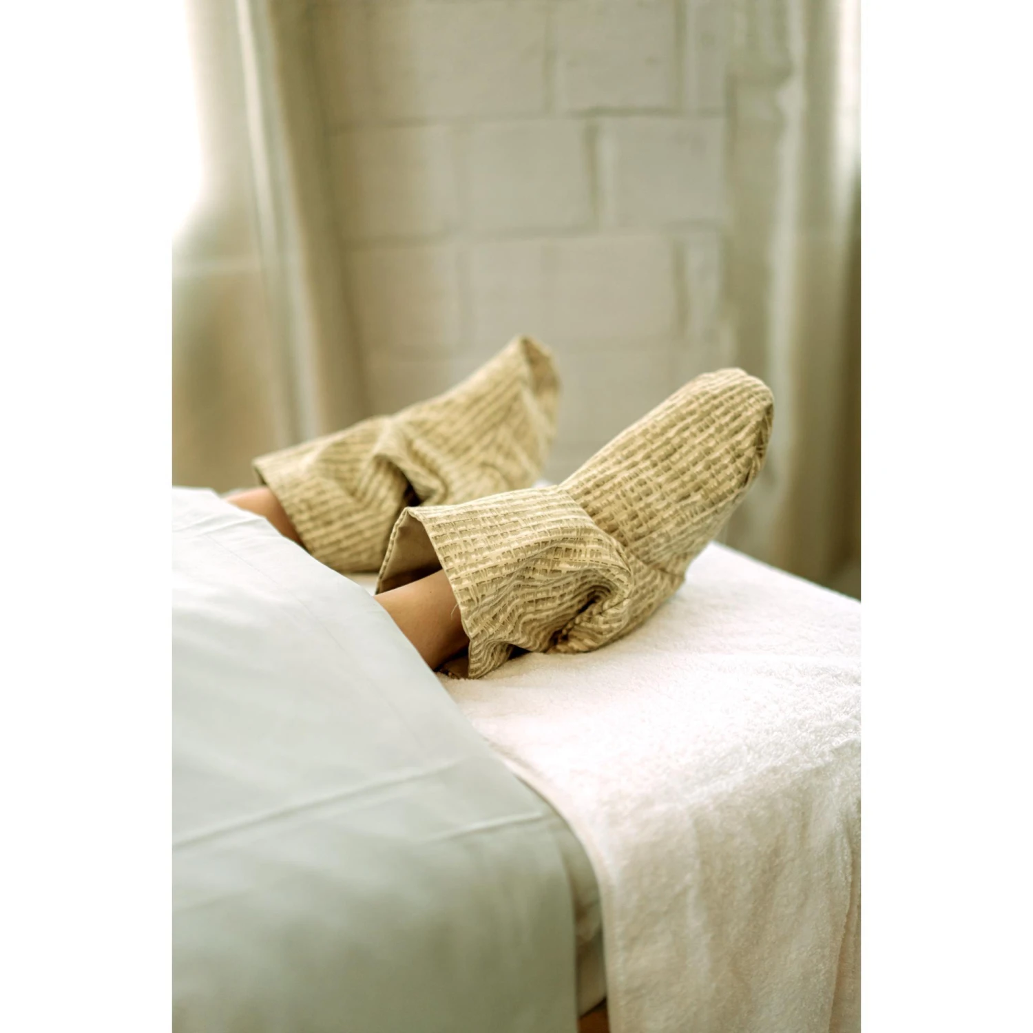 Enhance your treatments and services with a fabulous heat pack for the feet. These herbal booties contain all-natural ingredients and emit analgesic hot moisture, which is a preferred method of relieving sore muscles. Your clients will enjoy this truly serene experience, as it will put the whole body at ease. Made with durable, heavy duck fabric with soft khaki tone. Weight: approximately 1 lb., 3 oz. each.