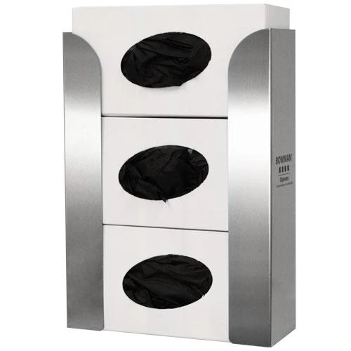 This glove dispenser mounts vertically and holds three boxes of gloves. It has keyholes for wall mounting. Stainless Steel. Made in the USA. Dimensions (rounded to the nearest 1/16″): 10.31″ W x 14.28″ H x 3.94″ D